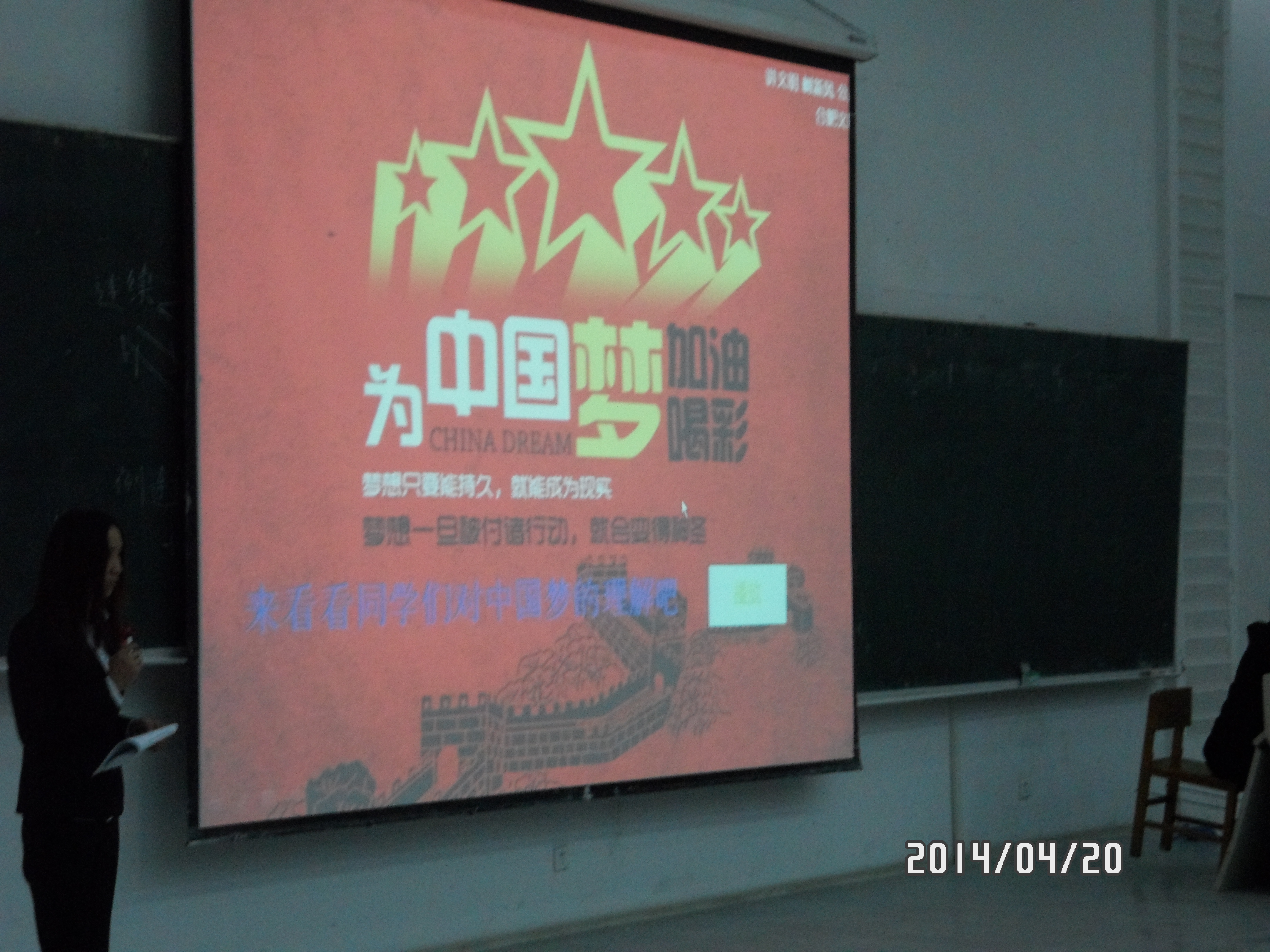 过往举办的与中国梦有关的活动。在各班结束表演后,由到场嘉宾打分评选出一、二、三等奖,并颁发奖状。颁奖结束后,同学们观看了VCR《我们身边的中国梦》。