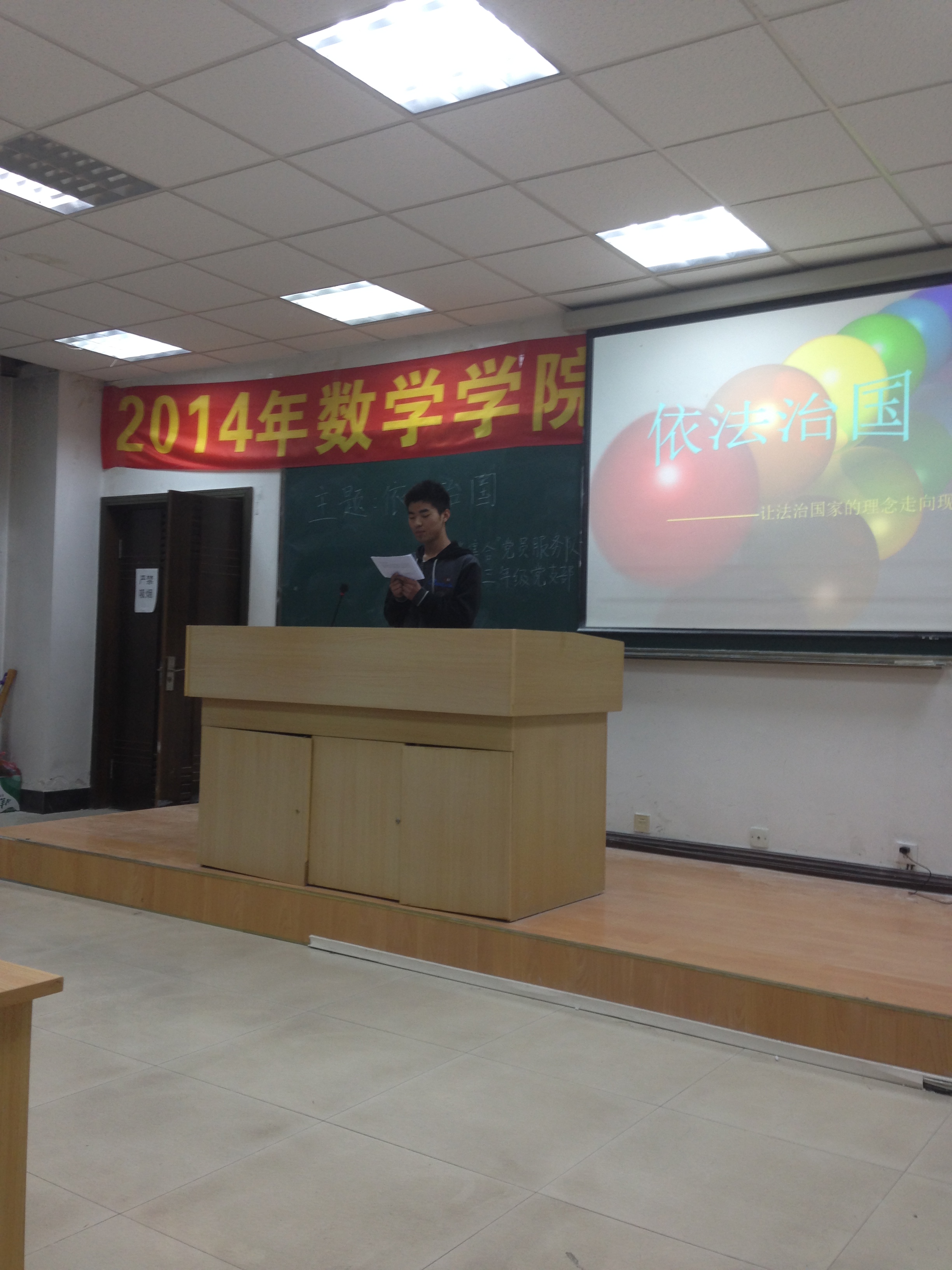 在数学楼一楼报告厅举办了“依法治国”座谈会,通过播放PPT和演讲等形式向同学们详细讲解了依法治国的相关内容。1月20日,全体志愿者来到宏盛社区进行志愿者活动。并在社区内全面随机调查了居民对法治的了解程度,还通过制作条幅等宣传活动,宣传了依法治国的相关内容。最后,我们对本次活动进行总结,交流心得与体会。