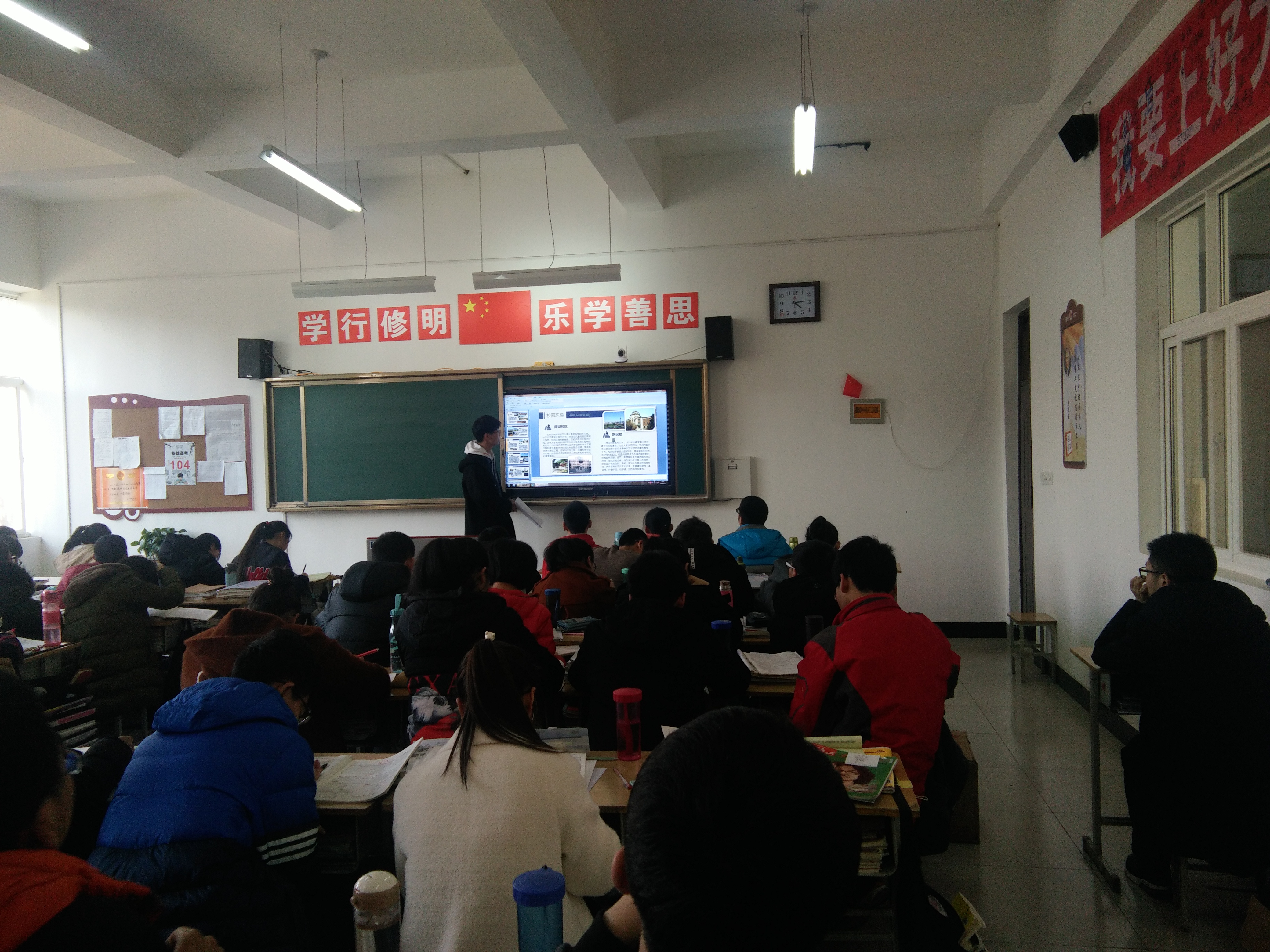 寒假社会实践宣讲活动。张宇兴小组提前制作了宣讲材料。经过高中老师的许可后,直接在学弟学妹的教室里进行了宣讲。宣讲小组先播放了《大美吉大》的招生视频,通过此次宣讲活动,有更多优秀的高三学子了解到韩国三级片