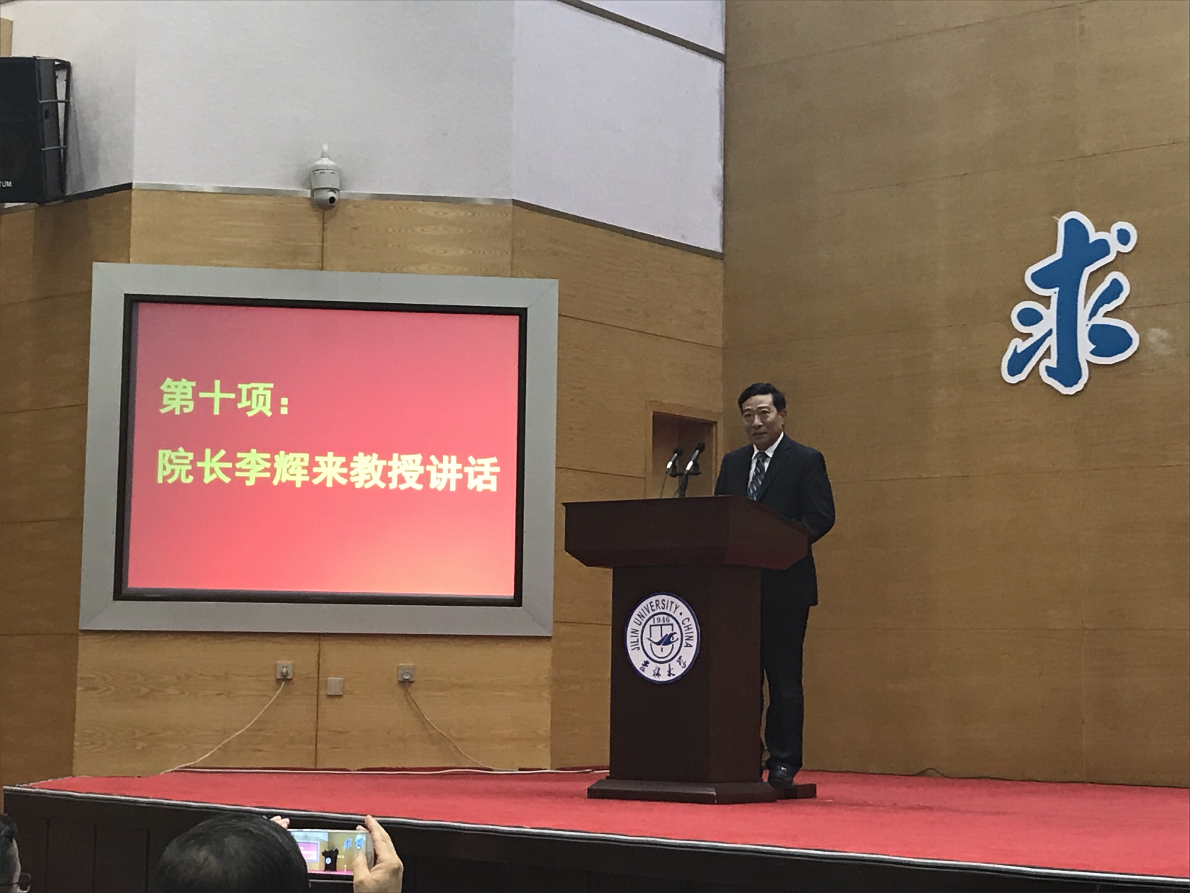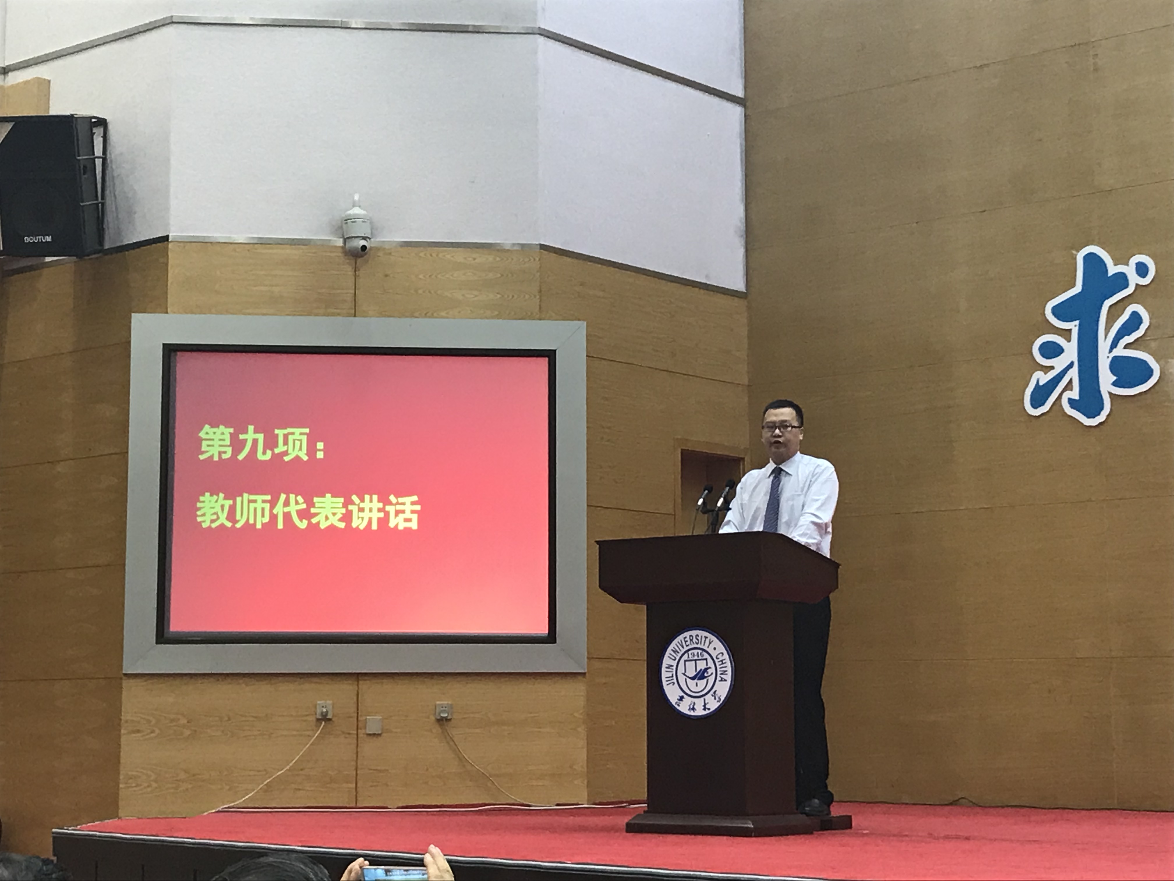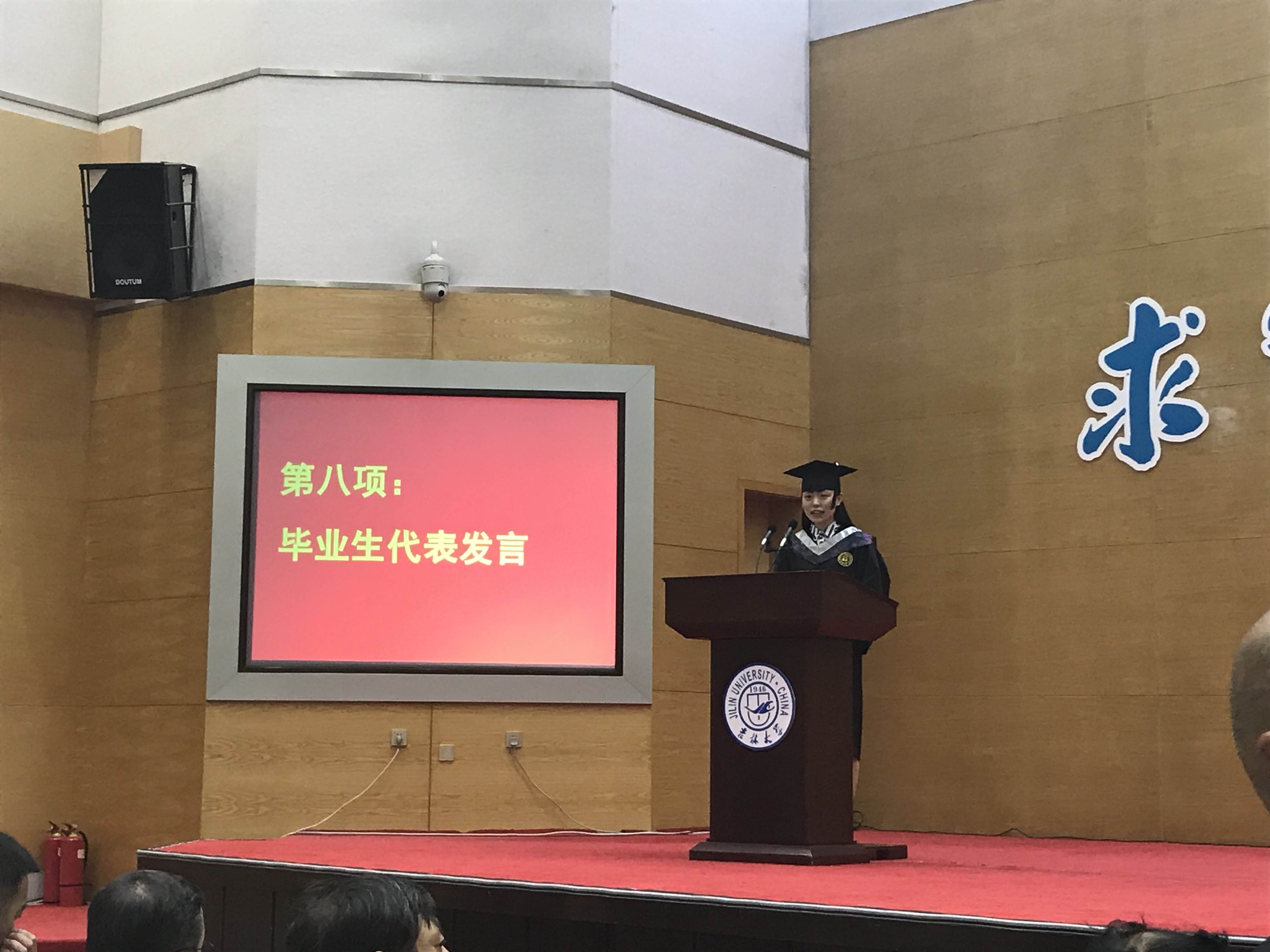 十佳大学生高溪远同学代表毕业生发言,韩玉柱副教授作为教师代表为毕业生送上祝福。最后,李辉来院长为毕业典礼致辞,向2018届毕业生提出了殷切希望,希望从吉大走出去的学生,能以更加博大的胸怀和包容的精神,能以改变世界的梦想力量和魂魄,成为伟大时代宏伟事业的缔造者和开拓者!