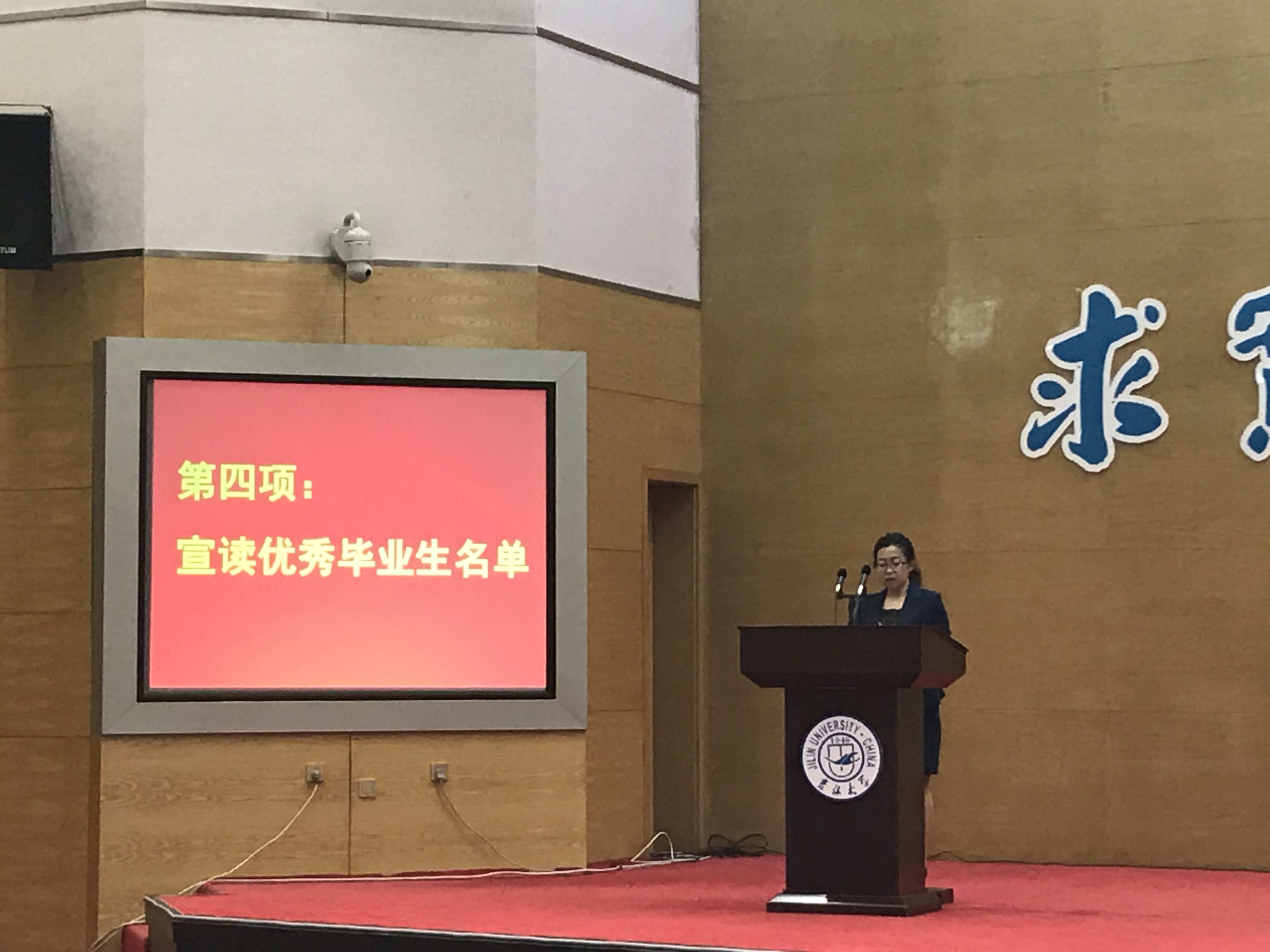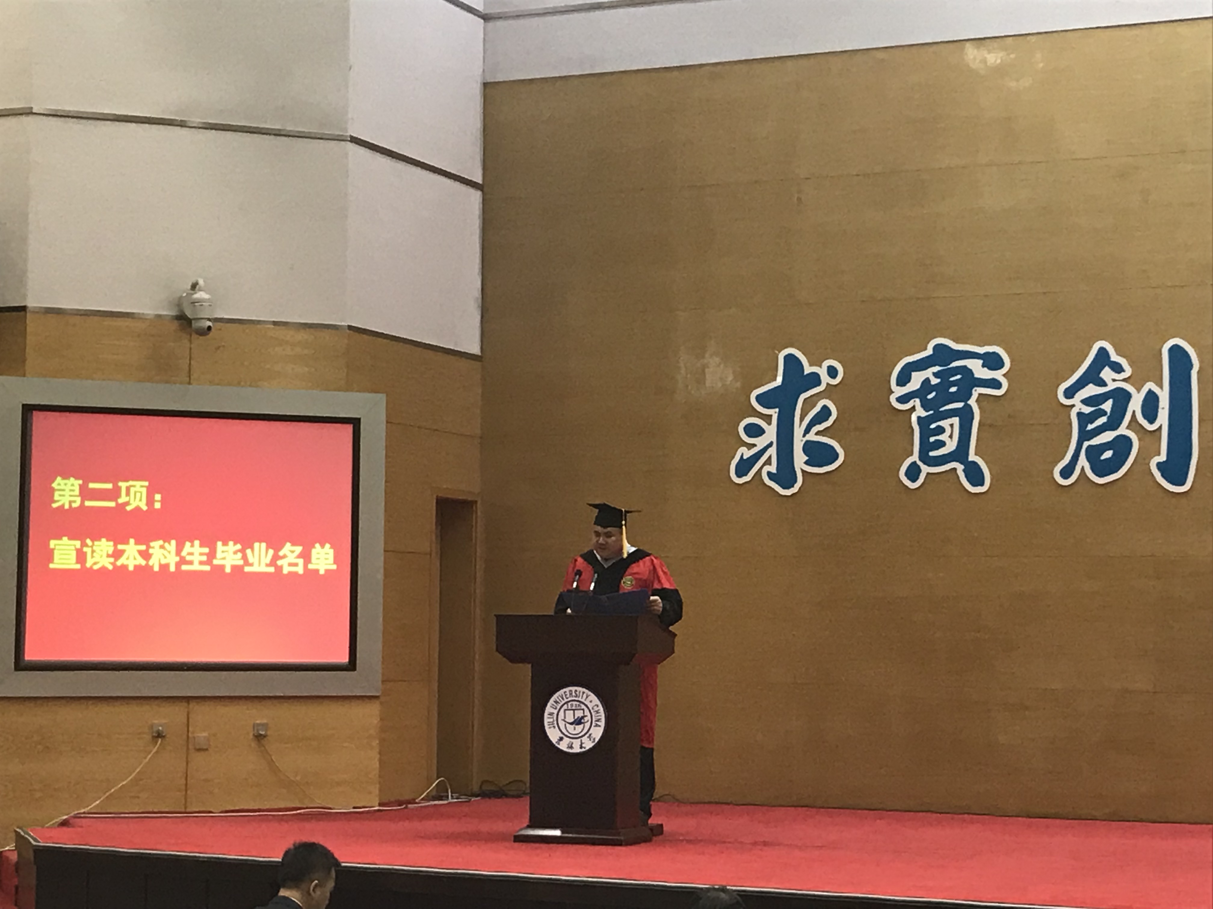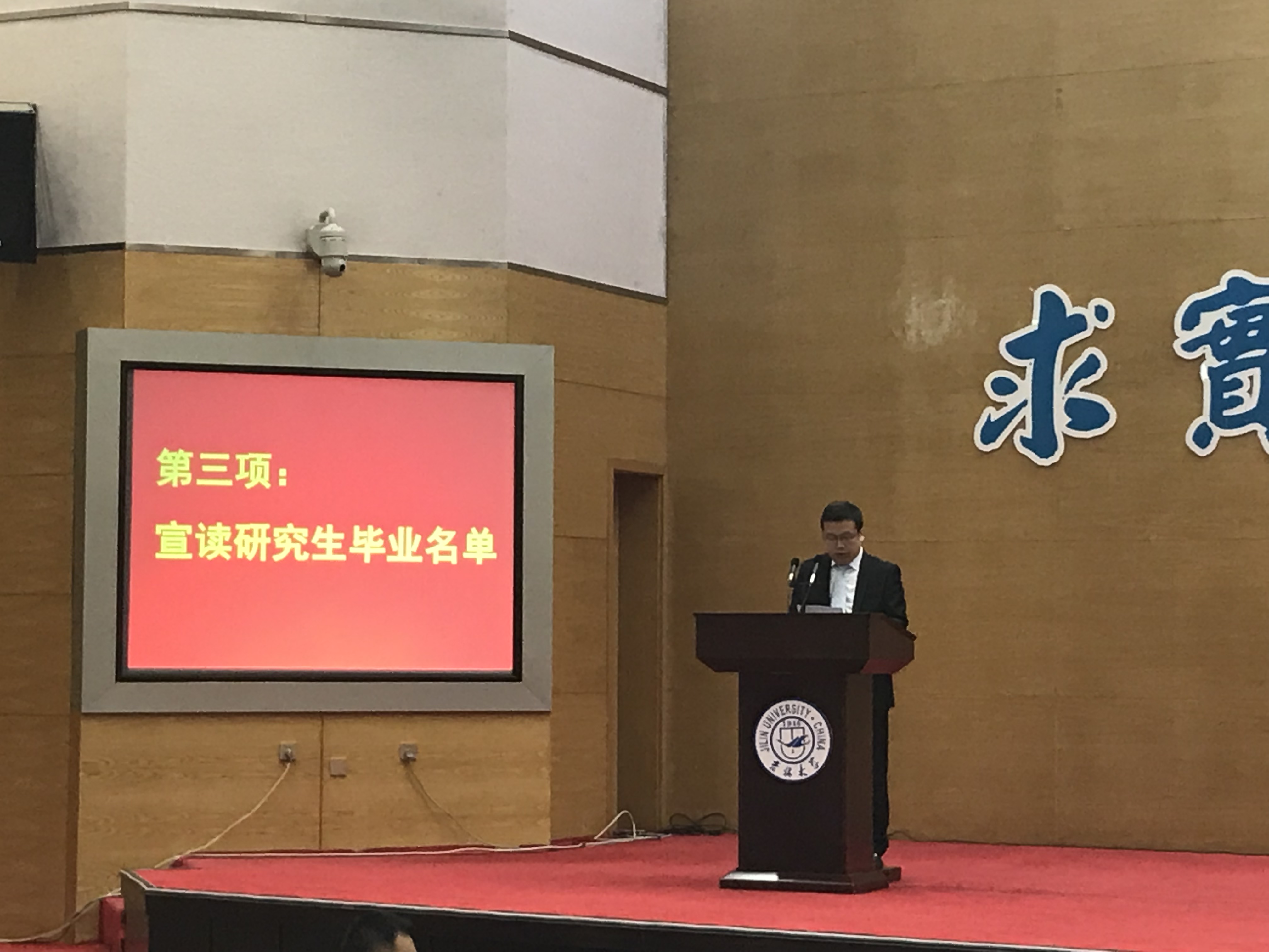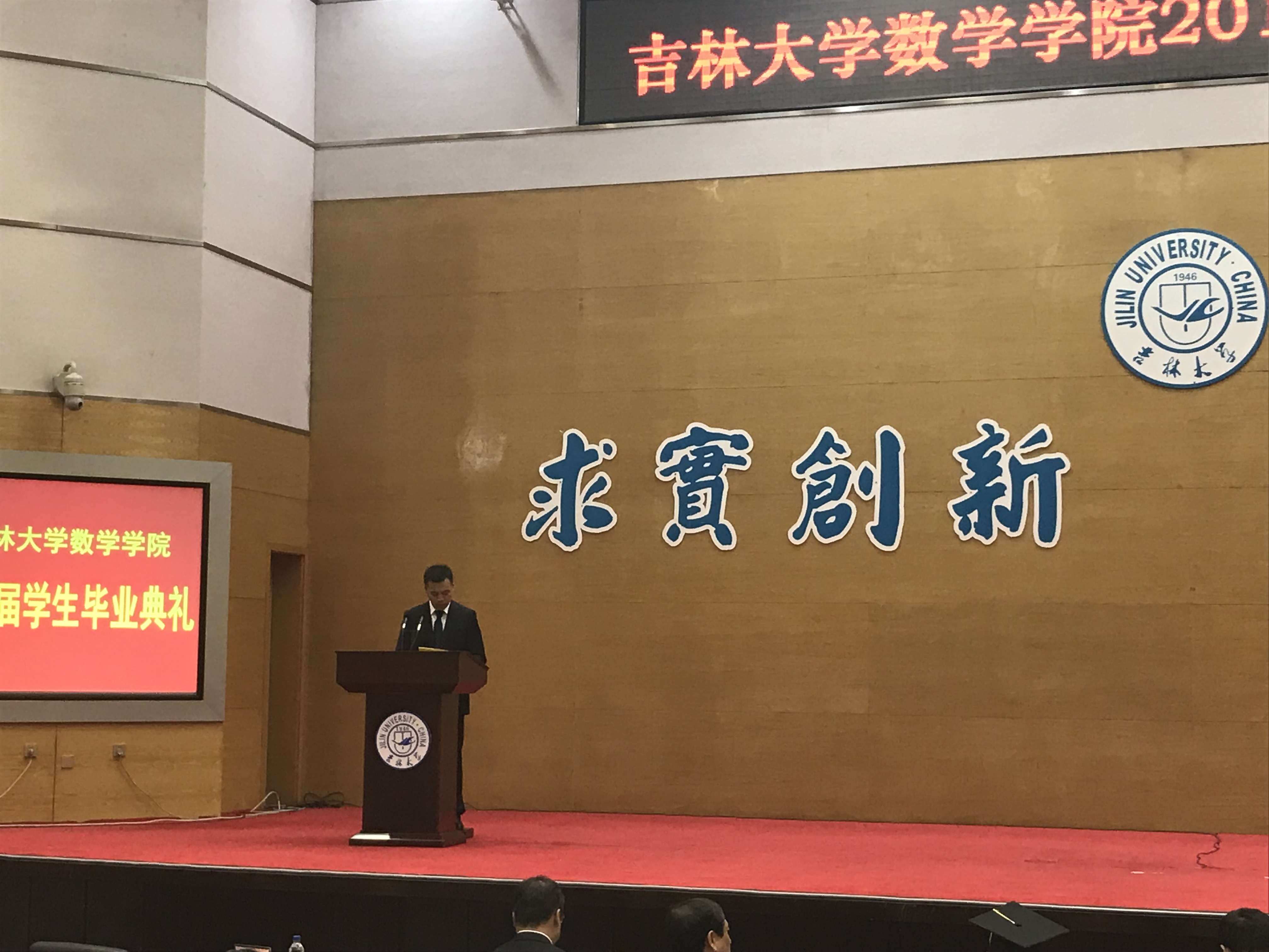 十佳大学生高溪远同学代表毕业生发言,韩玉柱副教授作为教师代表为毕业生送上祝福。最后,李辉来院长为毕业典礼致辞,向2018届毕业生提出了殷切希望,希望从吉大走出去的学生,能以更加博大的胸怀和包容的精神,能以改变世界的梦想力量和魂魄,成为伟大时代宏伟事业的缔造者和开拓者!