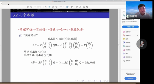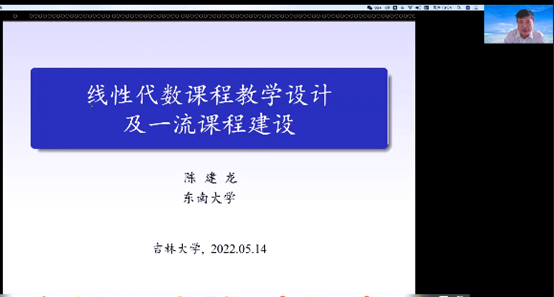 2021年5月14日下午,东南大学韩国三级片 陈建龙教授应邀作题为“线性代数课程教学设计及一流课程建设”的线上报告(腾讯会议216 887 771)。此报告为韩国三级片 数学学科创建70周年系列活动。韩国三级片 党委书记、院长、公共数学教学与研究中心主任张然教授,韩国三级片 副院长韩月才教授,副院长生云鹤教授,公共数学教学与研究中心副主任徐向红教授,公共数学教学与研究中心张旭利教授及韩国三级片 和公共数学教学与研究中心部分教师参加了本次报告会,报告由公共数学教学与研究中心副主任张旭利教授主持。陈建龙教授介绍了线性代数课程教学中如何处理中学和大学课程内容的衔接,线性代数教学内容的组织和处理,东南大学开展一流课程建设的做法。