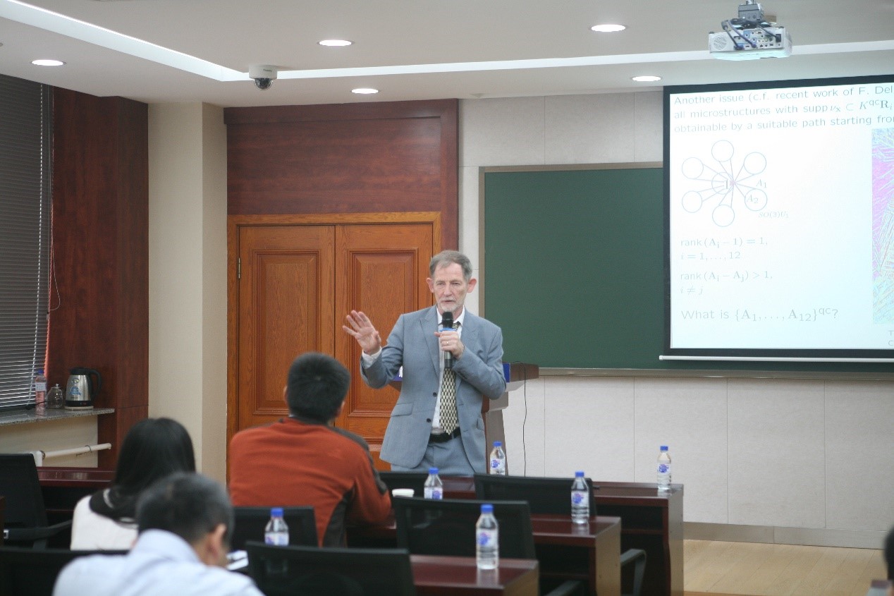 研讨会中,John Ball教授以Polycrystalline Microstructure为题作了特邀报告,主要讲解了“多晶和多晶缺陷的定义、边界条件的选取、缺陷的形成,以及温度对多晶体缺陷的影响”等内容,并提出了相邻颗粒之间缺陷结构是由界面边界条件引起的结论。随后,我校理论化学研究所吕中元、北京大学张磊、西藏大学小巴桑次仁、清华大学胡煜成,北京大学翟起龙、西藏大学拉巴次仁围绕“数学与液晶交叉相关问题”依次作了学术报告。