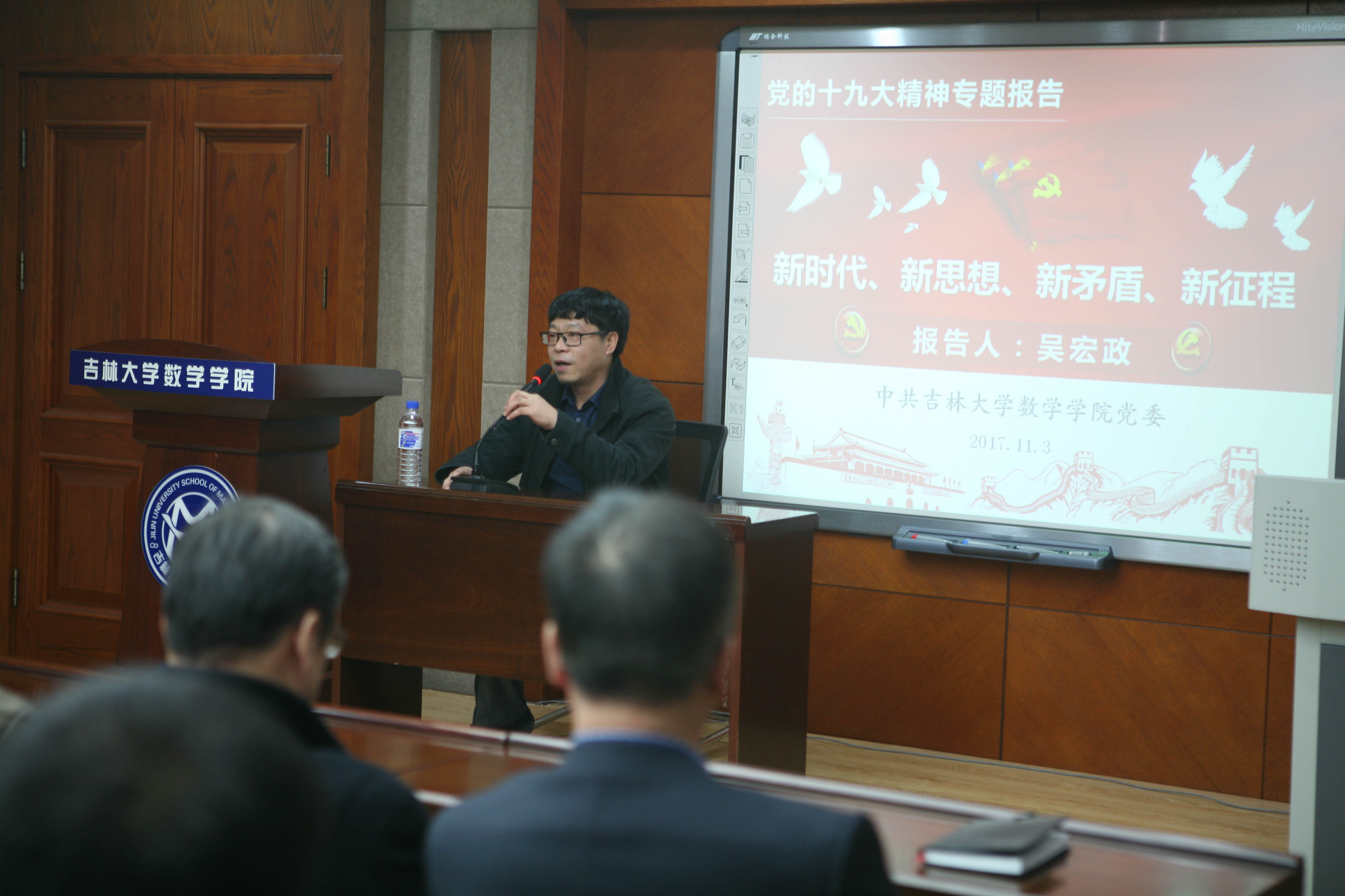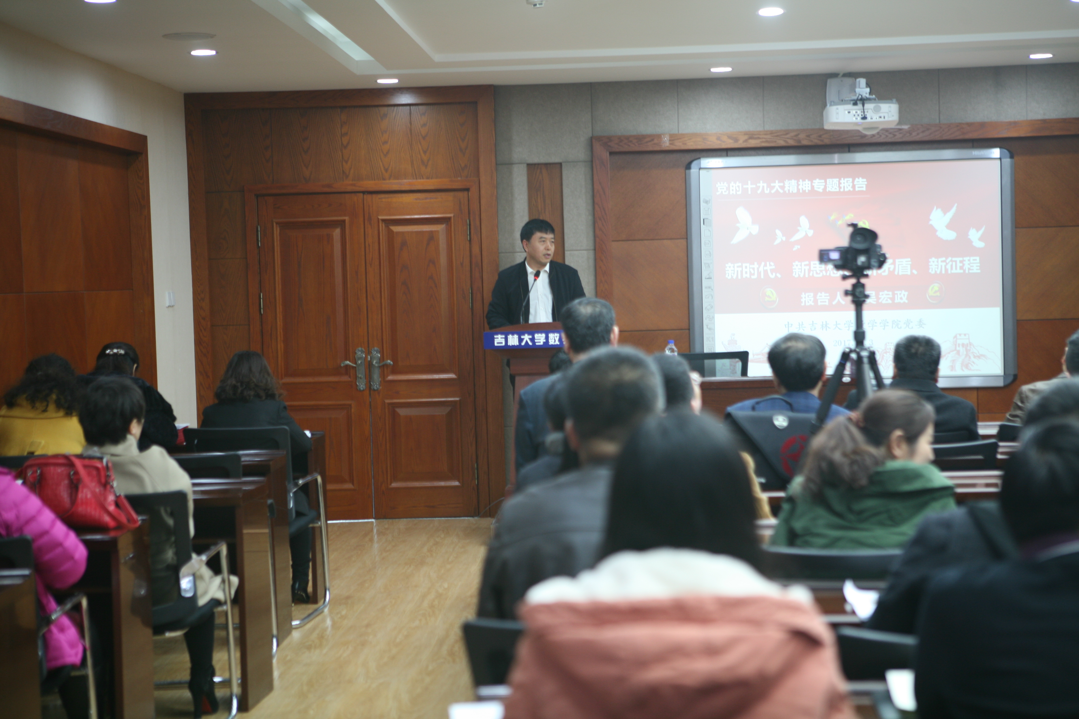 党的十九大精神宣讲团”成员、马克思主义学院副院长吴宏政教授为学院全体党员做了题为《新时代新思想 新矛盾 新征程》的专题学习辅导报告。学院领导班子成员、党委委员、教工党员、学生党员代表、部分民主党派和无党派人士参会。