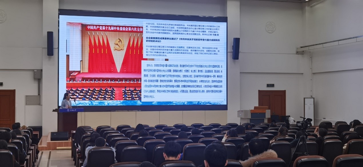 博士生讲师团讲师李天娇博士于数学楼二楼报告厅进行了十九届六中全会精神学习教育宣讲。本次宣讲的主题为“总结百年奋斗史•接续赶考新时代”——新中国以来国家领导人新闻发布的机制演变与基本经验”,学院研究生党支部党员、预备党员、积极分子参与了此次宣讲活动。
