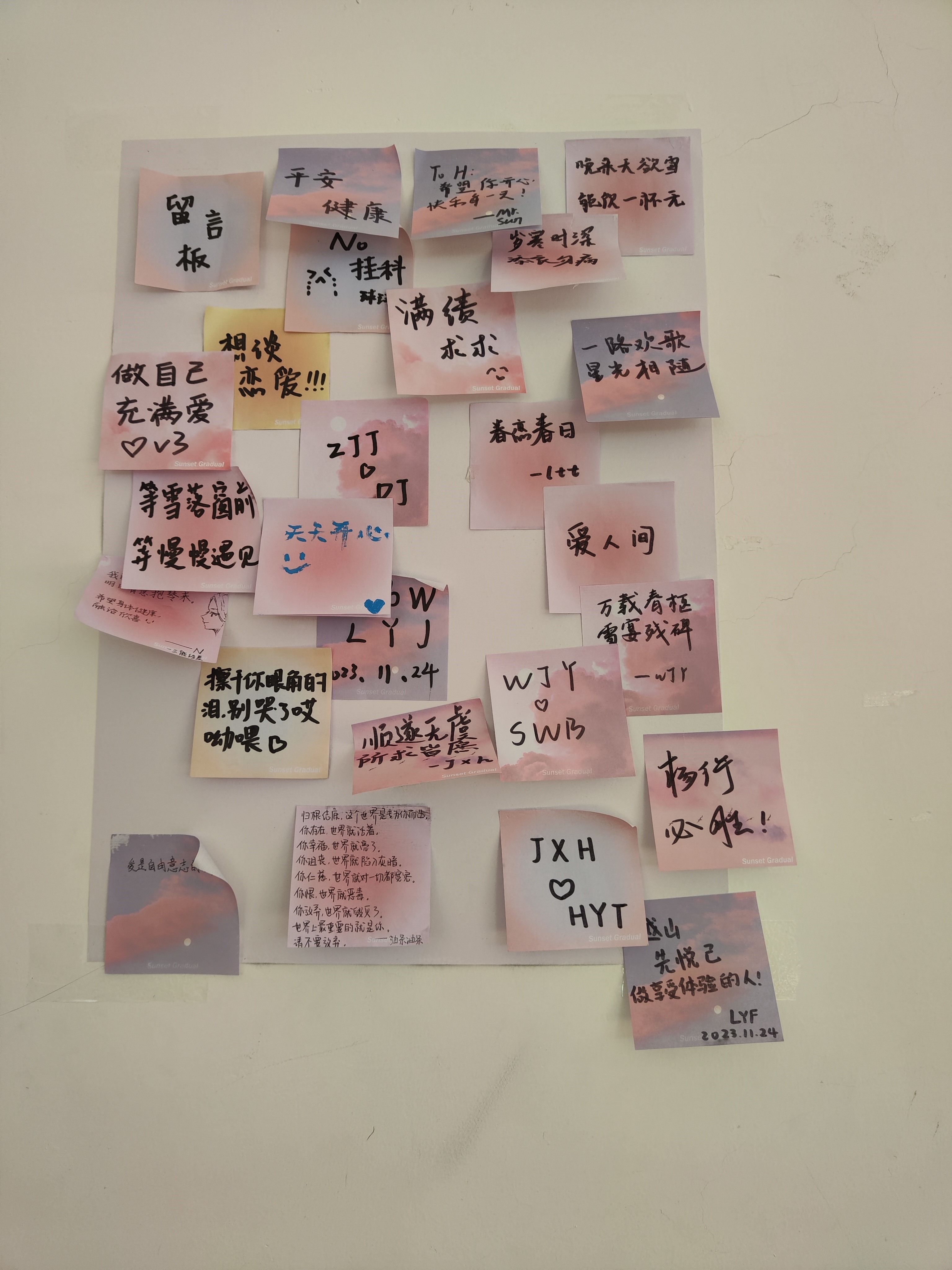 在各位同学完成自己的作品之后,便纷纷来到教室前面,领取工作人员精心准备的便利贴,随后同学们或者在便利贴上写下自己的愿望,由工作人员将这些愿望贴在心愿墙上,或者写下对陌生人的祝福,附在自己作品的后面,由工作人员连同作品一起送至长春市特殊教育学院,实现快乐的传递。
