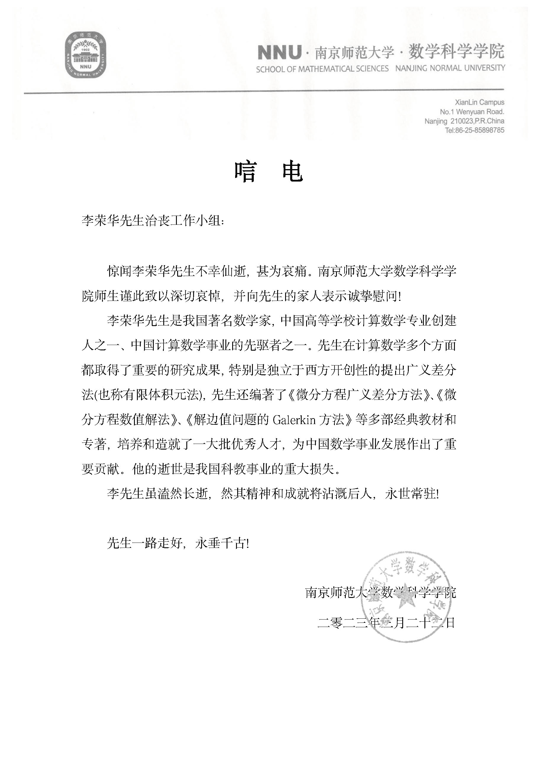 南京师范大学数学科学学院唁电