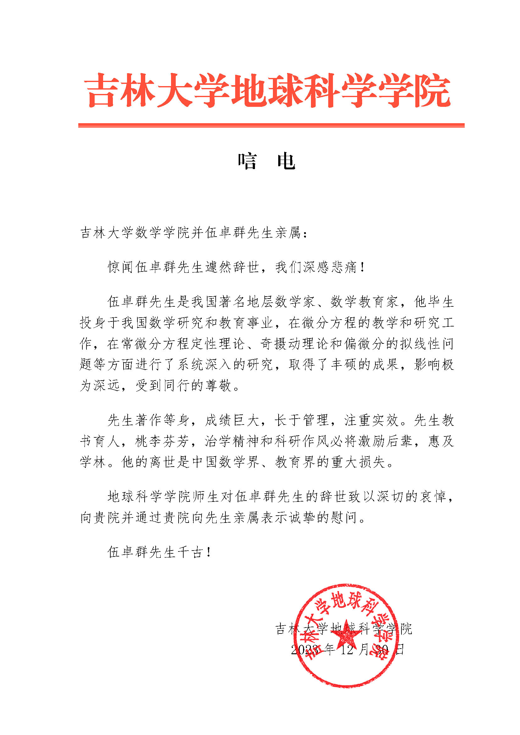 同济大学唁函